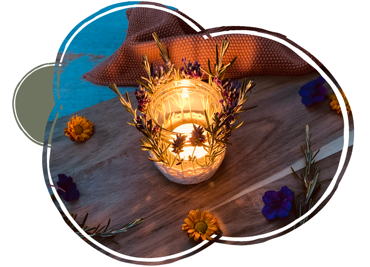 Zum Schluss füllt ihr noch ein bisschen Sand in das Glas, stellt ein Teelicht rein und euer blühendes Windlicht ist fertig 😊.