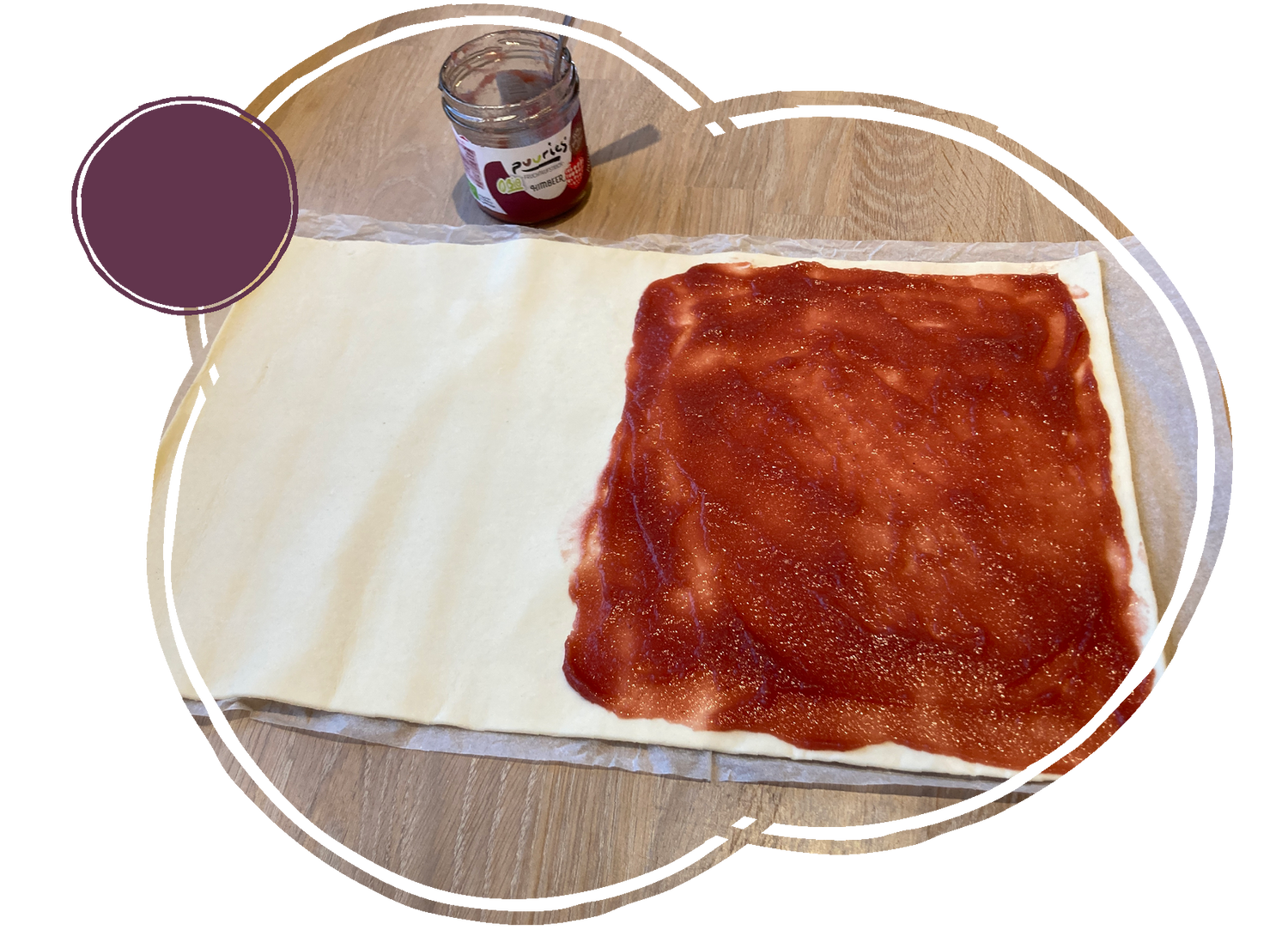 Ihr rollt euren Blätterteig aus und bestreicht ihn zur Hälfte mit puuries.