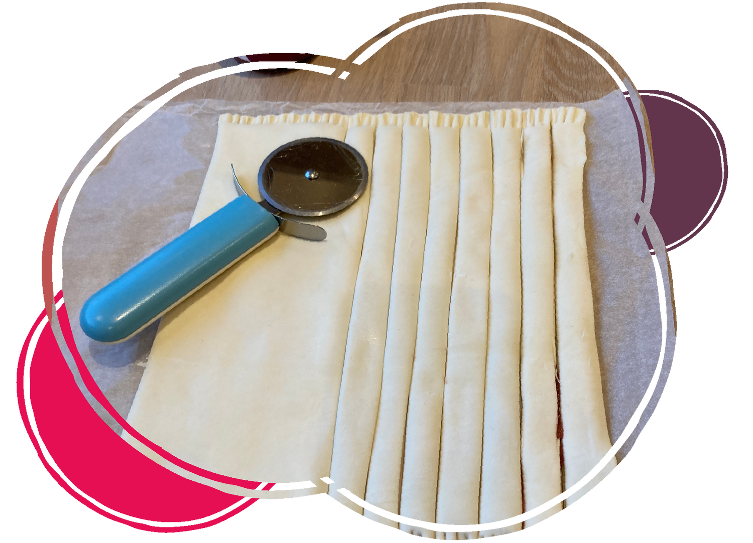 Jetzt schneidet ihr den Teig mit dem Pizzaroller in ca. 1,5 cm breite Streifen.